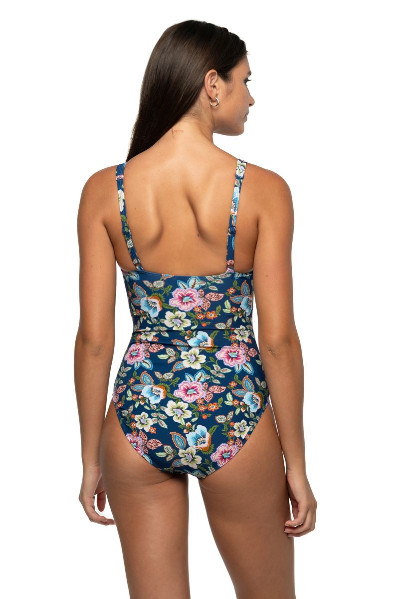 Immerse yourself in botanical elegance with this stunning one-piece, where lush florals bloom against a serene blue canvas. The Garden Gate design captures a romantic aesthetic perfect for the season, offering a sophisticated take on summer swimwear that celebrates nature's most enchanting palette.